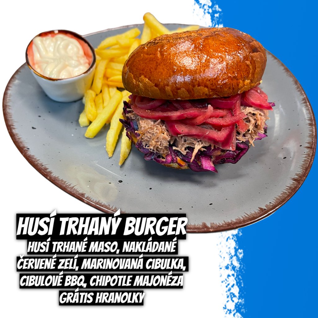 husí trhané maso, nakládané červené zelí, marinovaná cibulka, cibulové bbq, chipotle majonéza grátis hranolky