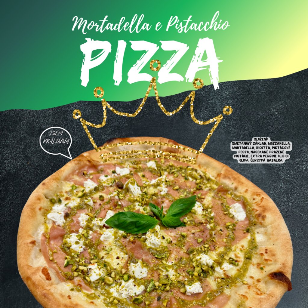 Složení: Smetanový základ, mozzarella, mortadella, ricotta, pistáciové pesto, nasekané pražené pistácie, Extra vergine olio di oliva, čerstvá bazalka.
